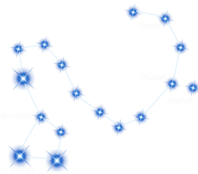 Your Guiding Star July 26th to August 7th If you were born between these dates, your guiding stars are Gianfar, which marks the Dragon's tail, and Kochab, an orange giant, which now lies in the constellation of Ursa Minor, the Little Bear, marking the Dragon's now vanished wing. Now known as the Guardian of the Pole, Kochab was the Pole Star itself around 3,000 years ago. December 17th to 23rd If you were born between these dates, your guiding stars are Grumium, which marks the Dragon's jaw, and Etanin, which marks its ear. |